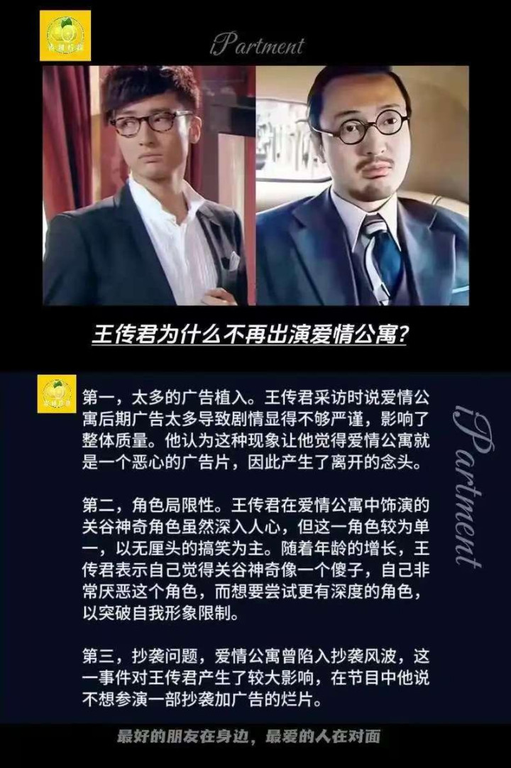 矛盾透彻爆发在《爱情公寓》电影版宣传技术,其时剧组全力接洽大电影,主打原班东谈主马情感,险些通盘主演都合作宣传,只有王传君不仅明确拒演,还在外交平台公开表态“不心爱”这部剧,以致径直吐槽剧集“抄袭”“买卖化严重”。