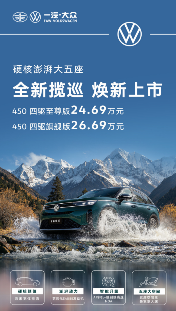 手脚一汽-世界面向高品性家庭出行打造的力作,全新揽巡自上市以来便以平衡实力获取等闲赞赏。其外不雅遴荐品牌最新规画说话,前脸R-Line泄露套件与不竭式幻影光环黑白分明,立体渐进式LED大灯造型猛烈且裕如科技感;车身侧面线条干净利落,短悬长轴布局灵验拓展车内空间,同期赋予整车建壮姿态,20或21英寸轮毂加捏下,泄露气味愈加浓郁;尾部规画延续简约大气立场,Surface LED立体尾灯不仅视觉后果出众,刹车灯更与前日行灯酿成玄妙呼应。举座来看,全新揽巡在外形塑造上完了了力量、优雅与功能性的有机和洽,充分知足现代家庭对理念念座驾的念念象。
