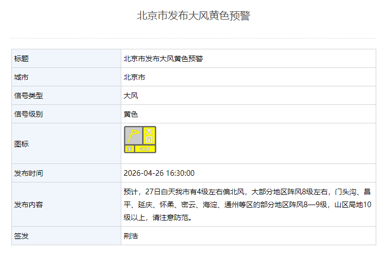 新京报讯 据北京市集所局音尘,北京市发布大风黄色预警。