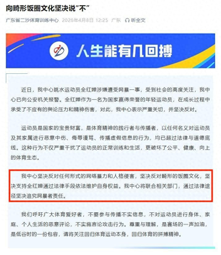 其所属的广东省二沙体育磨练中心说明报警的音书,加上国度体育总局、央视新闻等多家官媒的同步发声,让这开头来只在体育粉丝圈流传的争议,透顶升级为全社会共同温雅的天下事件。