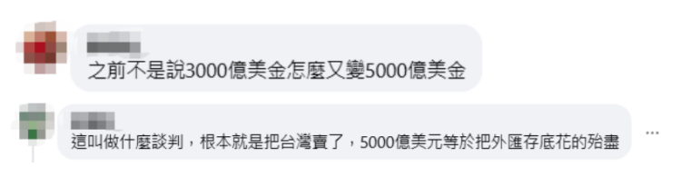 有网民质疑,“之前不是说3000亿美金,怎么又变5000亿”“这叫做什么谈判,根本就是把台湾卖了,5000亿美元等于把外汇存底花得殆尽”。