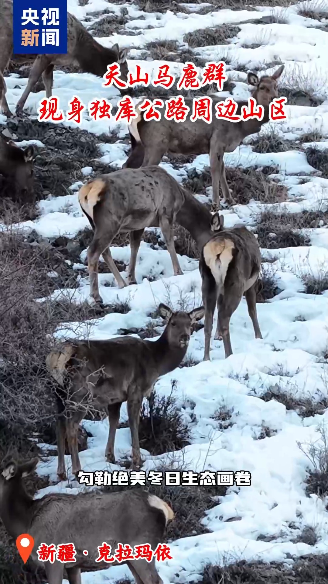 近日,新疆克拉玛依独库公路巴音沟段周边区域,有徒步爱好者拍到天山马鹿集群活动的珍贵画面。
