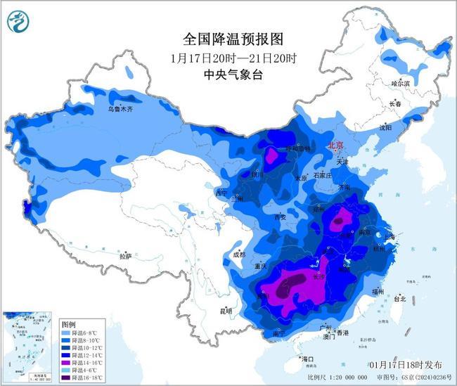预计,1月17日20时至19日20时,新疆、甘肃、内蒙古中西部、宁夏、陕西、华北、黄淮、江汉、江淮、湖南等地气温下降6~10℃,其中,新疆伊犁河谷及沿天山一带地区、内蒙古中部、湖南中部等地部分地区降温可达10~14℃,局地14℃以上。