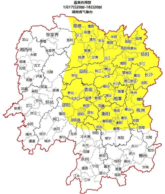 湖南省气象台01月17日16时继续发布霾黄色预警: