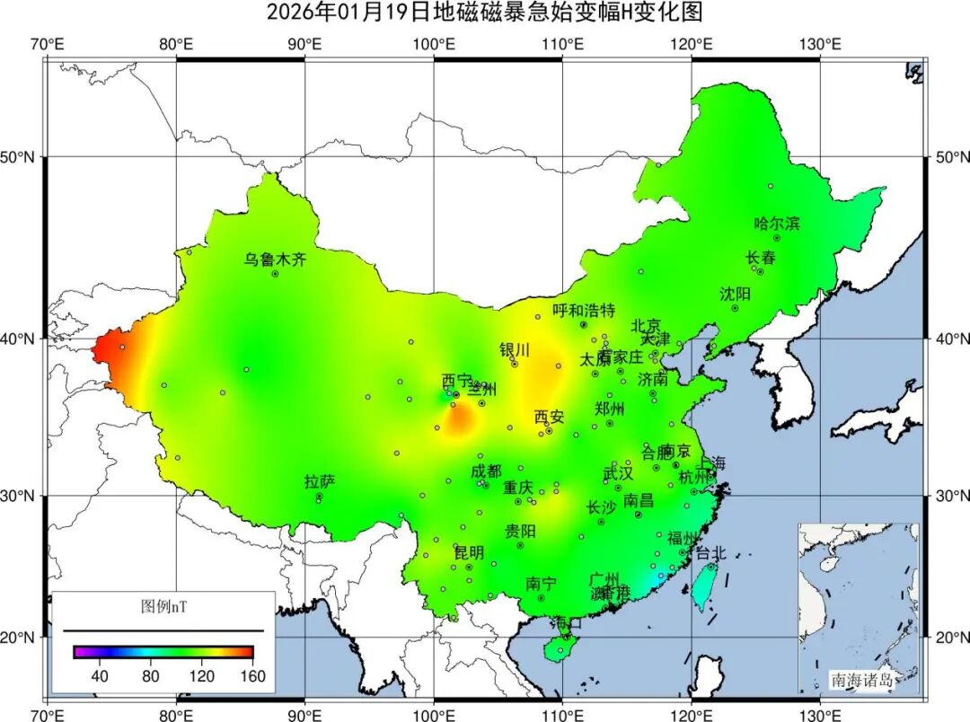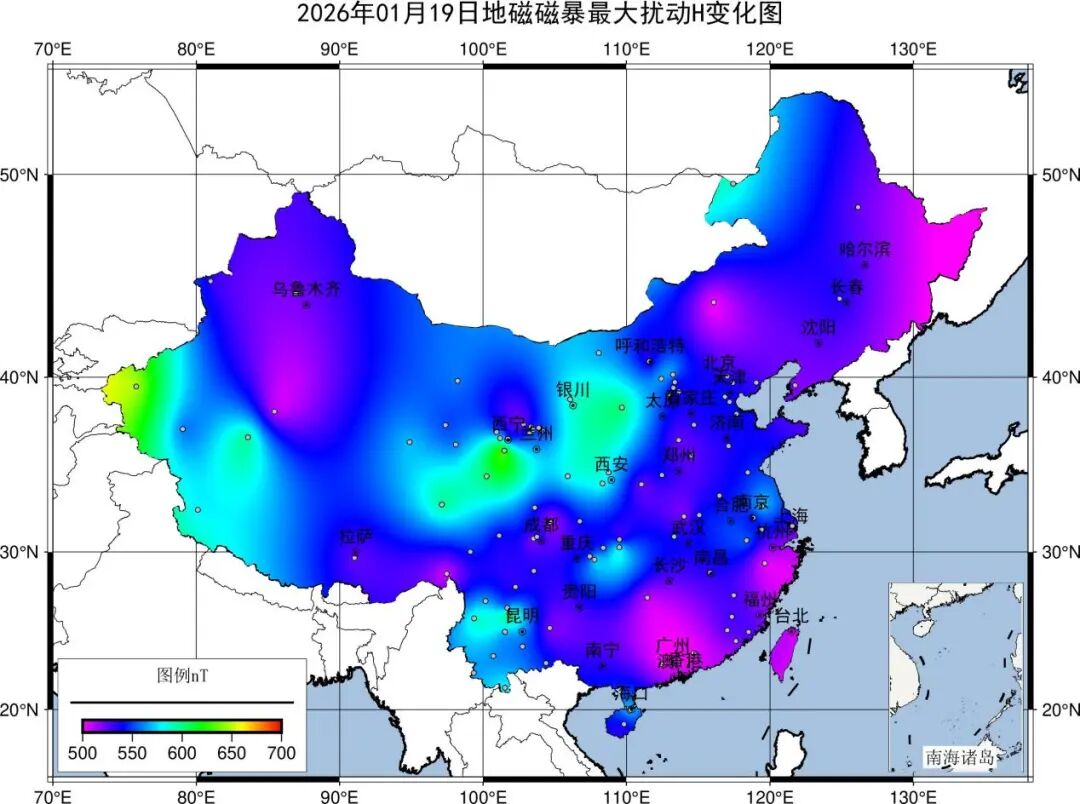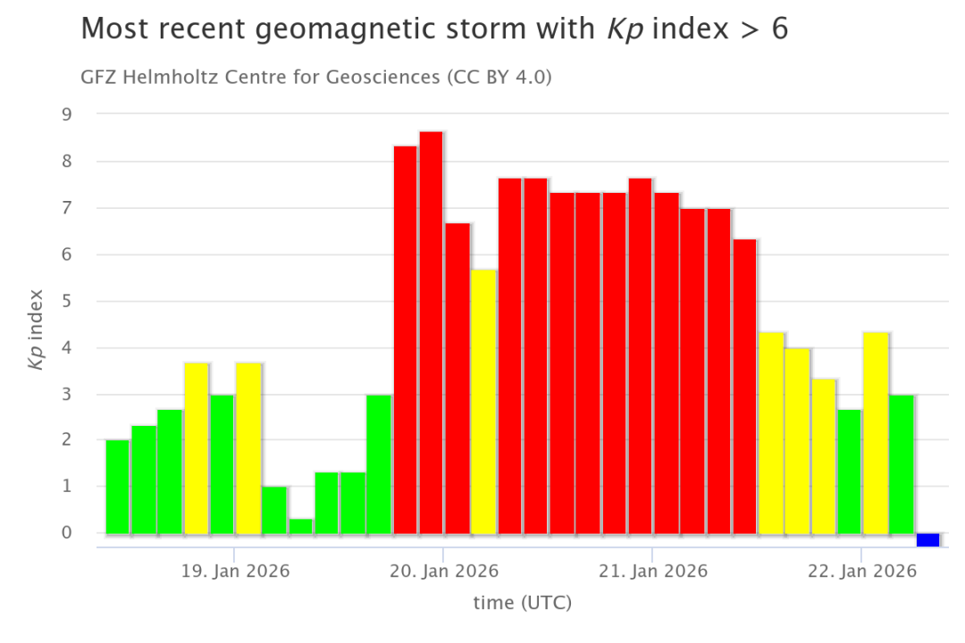 受全晕日冕物质抛射抵达地球的影响,地球磁场出现强烈扰动。世界时1月19日19:17,地磁场爆发了一场强烈的磁暴。根据德国亥姆霍兹地球科学中心公布的Kp扰动指数(图2),磁暴的最大扰动Kp指数达到了9- ,属于G4强磁暴级别。目前,磁暴仍在持续中。