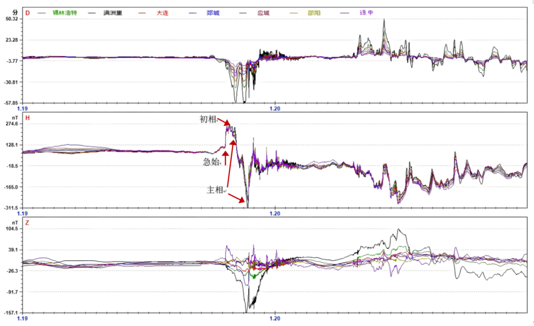 国家地磁台网中心(依托中国地震局地球物理研究所)拥有全国规模最大的地磁台网,能够对磁暴的发生与发展进程进行全程跟踪记录。图(3)展示的是东经120度经度链附近不同纬度地磁台站对本次磁暴事件的记录,从中可以清晰地看到,磁暴发生时,所有要素均会出现剧烈变化,其中水平分量H的变化最为显著,最能体现磁暴的过程特征。本次磁暴属于急始型磁暴,台站最大急始变幅达150nT(图4)。初相持续时间约1小时,在此阶段,磁场强度高于平静时期,不过扰动变化较小。初相过后,磁场迅速大幅下降,直至达到最低值,这一阶段为主相,是磁暴的主要特征。本次磁暴主相H分量在台站的最大变幅超过600nT(图5)。目前,磁场正逐渐向暴前水平恢复,但仍存在扰动起伏。