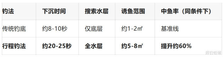看到没?行程钓法让饵料在水中多待了1.5倍以上的时辰,搜索限度扩大了3-4倍,这未便是给鱼多创造契机吗?