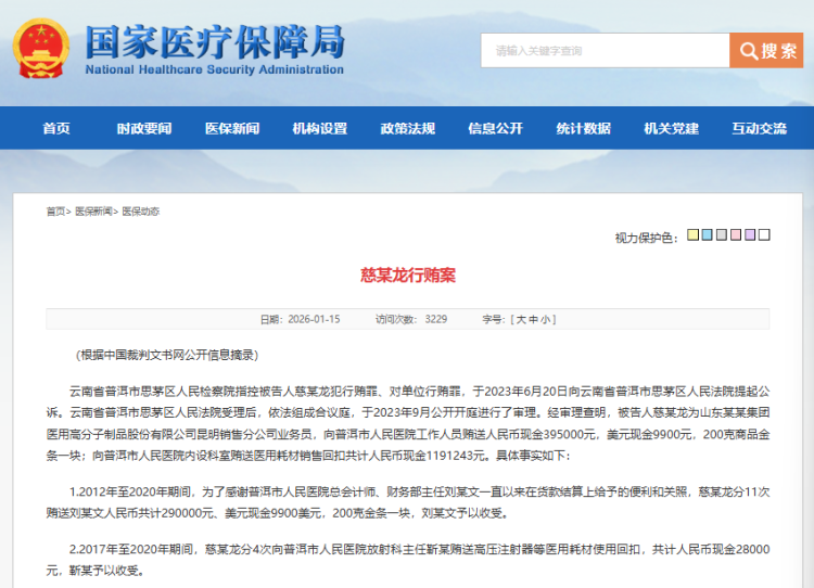 【环球网综合报道】2026年1月15日,国家医保局通报了“慈某龙行贿案”。经审理查明,被告人慈某龙为山东某某集团医用高分子制品股份有限公司昆明销售分公司业务员,向普洱市人民医院工作人员贿送人民币现金395000元,美元现金9900元,200克商品金条一块;向普洱市人民医院内设科室贿送医用耗材销售回扣共计人民币现金1191243元。