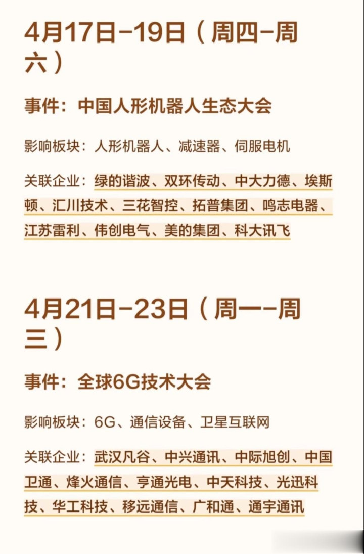 (2)中国东谈主形机器东谈主生态大会:将明确国产机器东谈主产业链的工夫道路、量产过程,径直带动延缓器、伺服电机、传感器等中枢步地的行情,是继AI之后的下一代科技干线。
