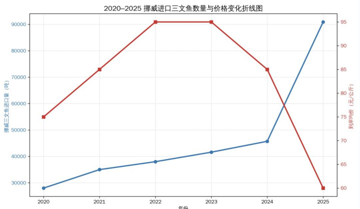 从记者梳理的统计图不错看出,从2020到2025年,挪威对华三文鱼生意呈现出极具反差的量价走势,中枢数据变化印证了商场供需状貌的绝对逆转。价钱方面创下近六年新低;出口量则同步迎来爆发式增长,6年间增幅高达225%,2025年入口量冲突 9万吨,竣事了“量价背离”的显耀走势。