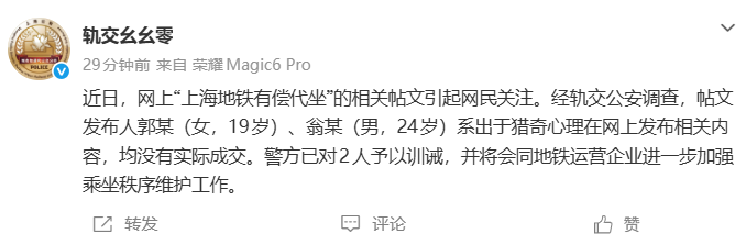 1月15日,据上海市公安局城市轨道和公交总队官方微博@轨交幺幺零 消息,2人出于猎奇发布“地铁有偿代坐”信息,均未成交,已训诫。