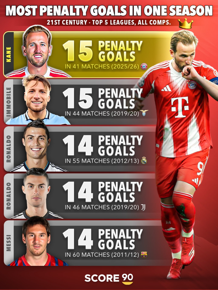 虎扑04月12日讯跟着本赛季各项赛事点球破门数来到15球,凯恩仍是追平了21世纪五大联赛球员单赛季各项赛事点球进球记载。