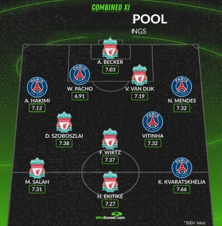 中场:索博斯洛伊(利物浦)、维尔茨(利物浦)、维蒂尼亚(巴黎)