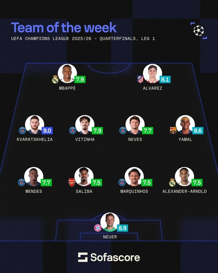 中场:克瓦拉茨赫利亚(巴黎,9.0分)、维蒂尼亚(巴黎,7.9分)、若昂·内维斯(巴黎,7.7分)、亚马尔(巴萨,8.6分)